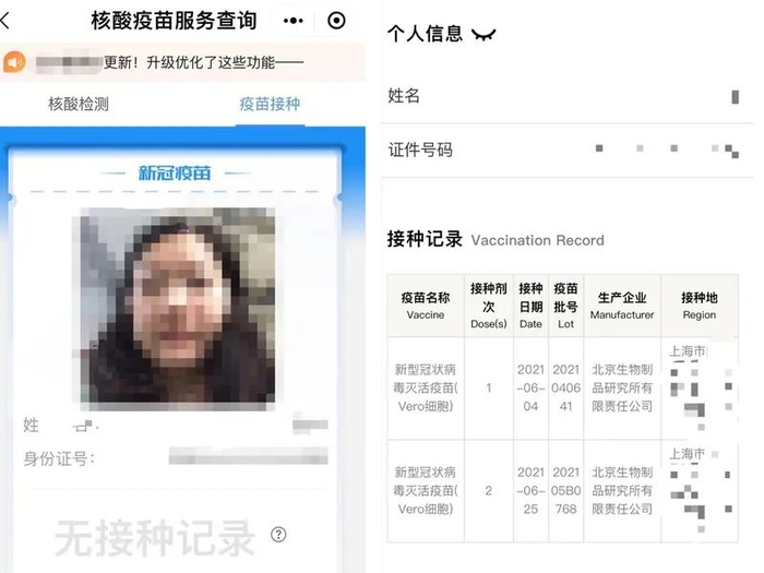 左图为记者通过网传小程序查询的接种情况,右图为记者通过随申办查询的接种情况。