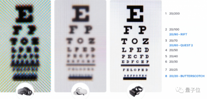 为解决视觉分辨率问题,扎克伯格展示了一个最新的头显原型Butterscotch,分辨率数据,可以实现60 PPD,允许20/20视力的视网膜分辨率。