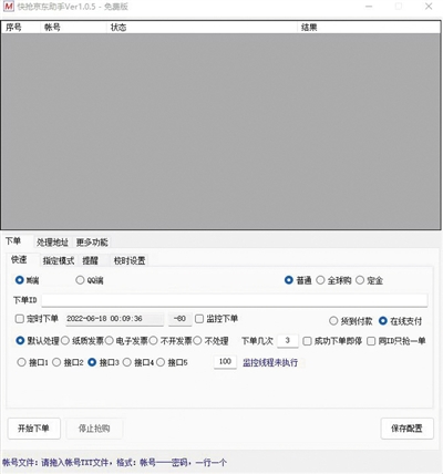 在一些黑灰产论坛中,贝壳财经记者也找到了不少抢单工具,在一款名为“快抢京东助手”的软件中,记者发现其可以自动设置下单时间、抢单次数、抢单ID等,甚至还能设置是否开发票。该软件开发者在“说明教程”中称,抢购的关键在于设置好参数,“秒杀时根据你不同的网络环境,不同的参与人数都略有不同,需要自己根据经验判断,如果不会设置请保持默认即可。”