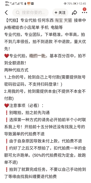 除售卖抢单软件的卖家外,还有不少卖家直接表示提供抢单服务,如一个标价25元提供“稳定代拍”的卖家表示,其可以稳定在0秒下单,1秒付款,须提前发送需要抢单的商品链接,并提前垫付资金,“专业代拍,基本百分百中,拍不到全额退款。”而另一个代拍卖家则表示,代拍价格需要根据买到的商品来定,“收取商品价格5%的代拍费”。