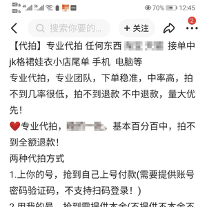 除售卖抢单软件的卖家外,还有不少卖家直接表示提供抢单服务,如一个标价25元提供“稳定代拍”的卖家表示,其可以稳定在0秒下单,1秒付款,须提前发送需要抢单的商品链接,并提前垫付资金,“专业代拍,基本百分百中,拍不到全额退款。”而另一个代拍卖家则表示,代拍价格需要根据买到的商品来定,“收取商品价格5%的代拍费”。