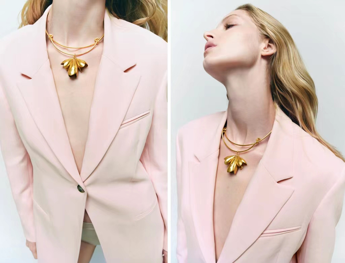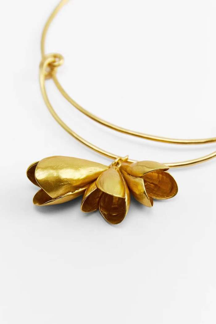 类似铃兰花样式的硬质金色颈圈项链十分耀眼夺目,含苞待放的花朵形象加上金色氛围,佩戴时呈现出摩登复古的都市气息,这款同样拥有浮夸风格,想要搭配得体,是需要费些心思的。