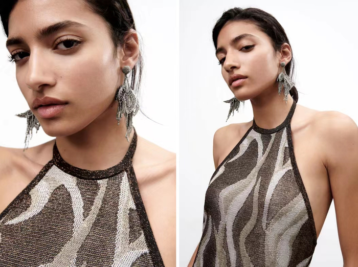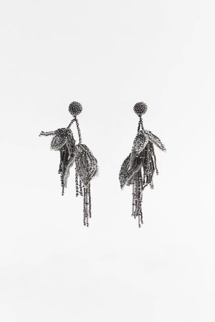 花卉耳环一款选用太空灰串珠材质,将花朵的垂坠感和在微风中摇曳的姿态生动展现,适合喜欢较为夸张风格的时尚迷;另一款耳饰选用渐变亚克力材质,奶油白色的绽放着的花朵被设计成层叠样式,突出花朵的立体视觉效果,这款耳环比较百搭,日常适合搭配西装外套,或参加音乐节,派对,出街都能轻松驾驭。