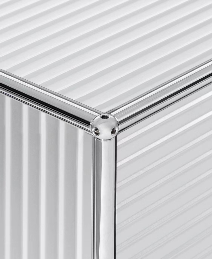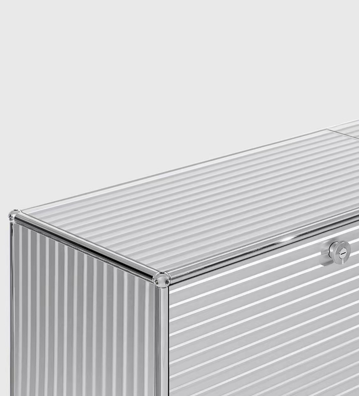 本次Rimowa又与瑞士家具品牌USM Modular Furniture合作推出一款银色的收纳柜,虽然这款储物柜还未释出任何发售信息,却已经在社交媒体中引发了无数人的谈论与关注。Rimowa x USM Modular Furniture收纳柜采用USM于1960年推出的USM Haller储物柜造型,通体换装成Rimowa经典铝镁合金的凹凸纹饰设计,简约的造型与细节设计完美契合,呈现出干净利落,低调奢华的格调。