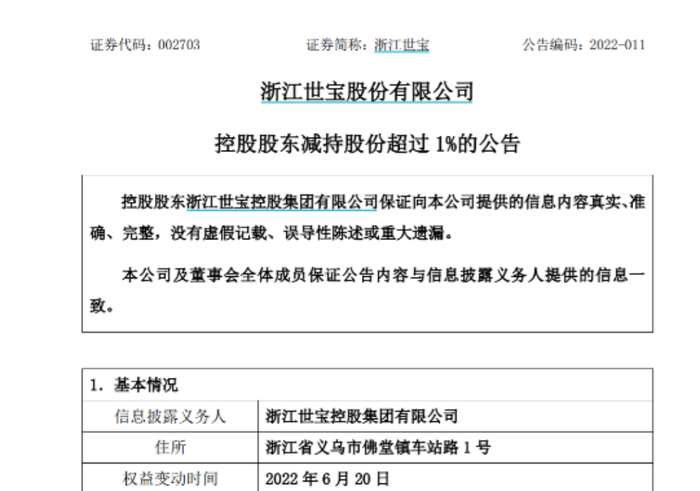 浙江世宝6月20日晚间公告称,公司控股股东浙江世宝控股集团有限公司于2022年6月20日通过大宗交易减持2%股份。本次减持完成后,浙江世宝控股集团仍然持有浙江世宝41.28%的股份。