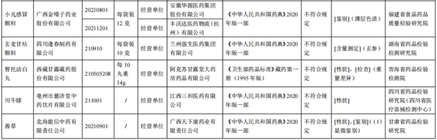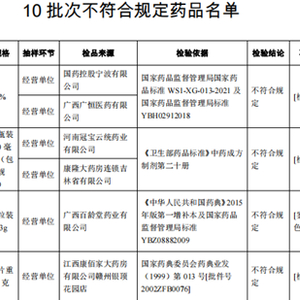 国家药监局近日发布通告,经福建省食品药品质量检验研究院等8家药品检验机构检验,标示为广西金嗓子药业股份有限公司等9家企业生产的小儿感冒颗粒等10批次药品不符合规定。