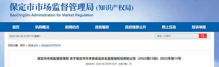 中国质量新闻网讯 2022年6月20日,河北省保定市市场监督管理局网站发布关于保定市市本级食品安全监督抽检信息的公告(2022第15批)2022年第15号。本次发布的监督抽检信息涉及19大类食品,共抽检样品189批次,其中合格183批次,不合格6批次。