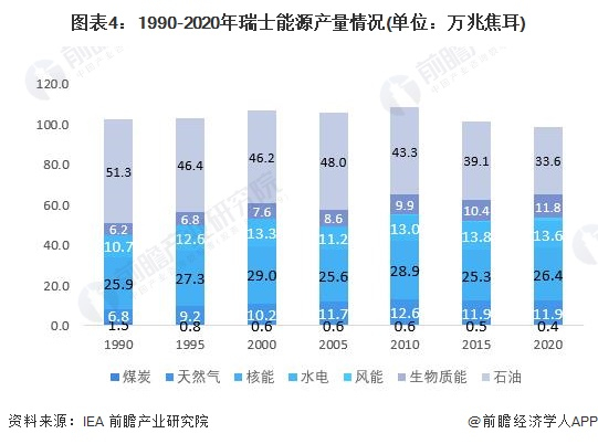 瑞士的矿产资源较为匮乏,可再生能源的发展亦在欧盟车尾,故整体的能源产量相较于欧盟其他国家均处于较低水平。从境内产量水平来看,石油和核能是瑞士主要发展的能源工业,产量居于全国能源产量前列。另外,在德国等国家发展光伏、太阳能的同时,瑞士在该类能源的发展却较为缓慢。