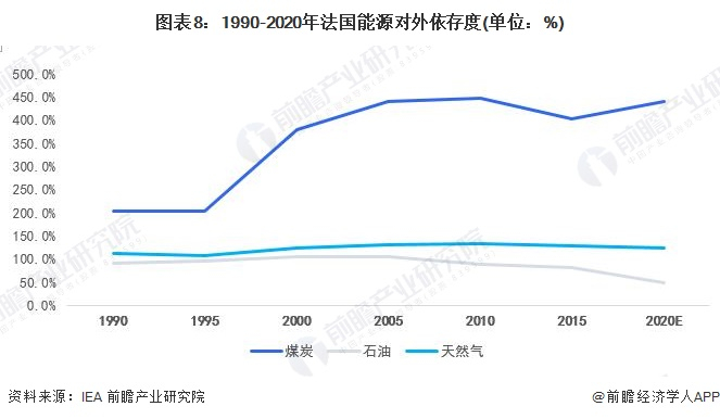 法国能源结构中,核能等可再生能源占比较高,自给率充足。在三大传统能源的对外依存度较高,煤炭的对外依存度超过400%,除了作为燃料,工业用煤需求量亦较大。天然气是第二大对外主要依赖的能源,依存度超过100%。