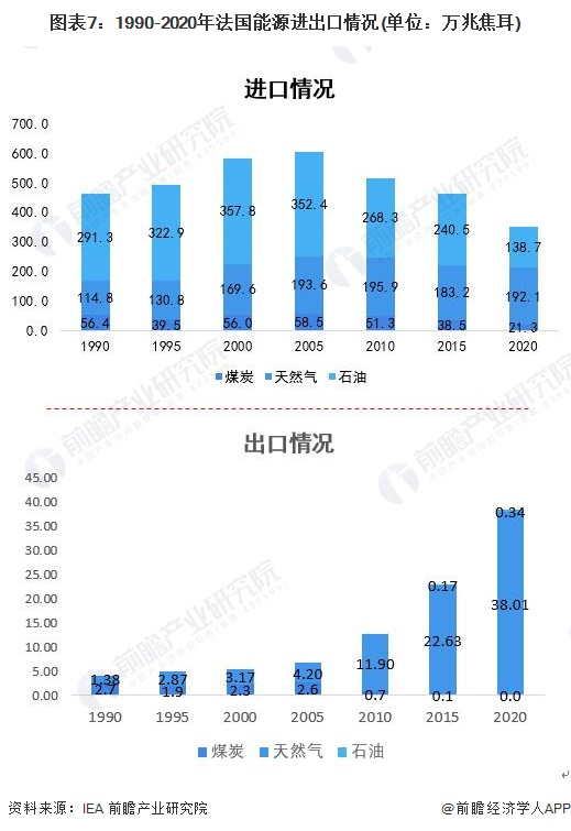 法国传统能源对外依赖度较高,法国石油2020年进口量占传统能源进口量的39.39%。煤炭依赖程度亦较高,早在2004年,法国就关闭了境内的最后一座煤矿,目前煤炭基本依赖进口。法国传统能源境内产量不足,对应出口量亦捉襟见肘。
