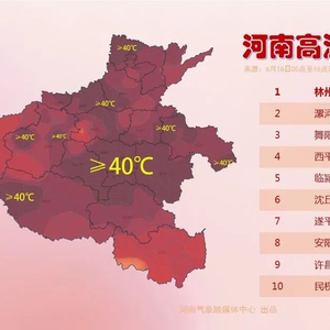 16日和17日,全市分别有87%和65%的区域气象站气温超过40℃,其中16日襄城县姜庄最高气温43.5℃,17日建安区蒋李集最高气温43.1℃。