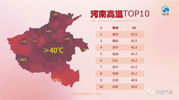 6月16日国家气象站许昌站最高气温41.2℃,为1961年以来同期次高值(1972年6月11日国家气象站许昌站最高气温41.9℃)。