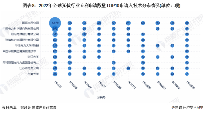目前,全球光伏行业专利申请数量TOP10申请人技术主要布局在H02J3细分领域,其中全球光伏专利申请量第一的国家电网公司在该细分领域专利申请量达到1878项。