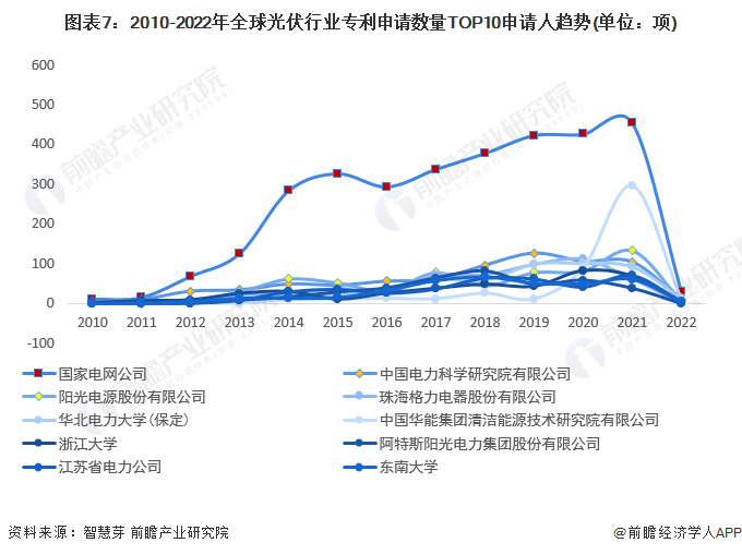 全球光伏行业专利申请数量TOP10申请人分别是国家电网公司、中国电力科学研究院有限公司、阳光电源股份有限公司、珠海格力电器股份有限公司、华北电力大学(保定)、中国华能集团清洁能源技术研究院有限公司、浙江大学、阿特斯阳光电力集团股份有限公司、江苏省电力公司和东南大学。