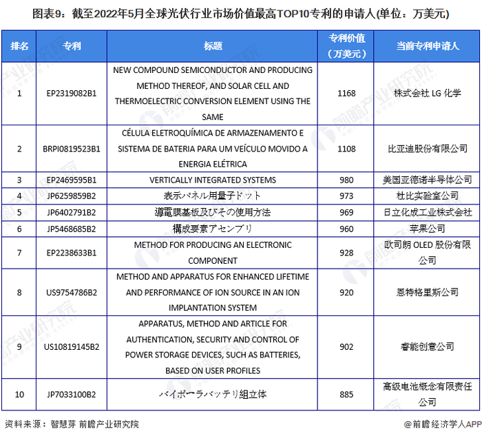 全球光伏市场价值最高TOP10专利中,韩国株式会社LG化学独占鳌头,其次是中国的比亚迪股份有限公司和美国的美国亚德诺半导体公司,三家公司专利价值分别为1168万美元、1108万美元和980万美元。