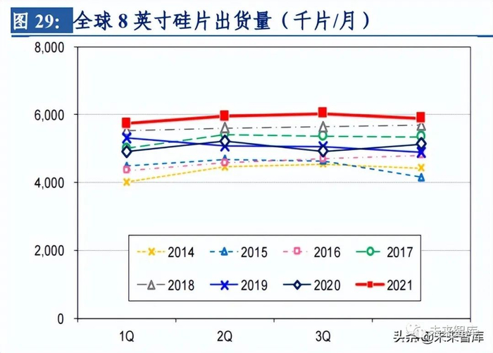 新能源汽车销量提升带动硅片需求大幅上升。根据 SUMCO 数据,新能源汽车单车对硅 片面积的需求是内燃机汽车的 2 倍。新能源汽车相较传统燃油汽车对 MCU、功率半导体、 传感器等半导体器件的需求均有大幅提升。据中国汽车工业协会的数据显示,每辆传统 内燃机汽车需要 500-600 颗芯片,而新能源汽车单车芯片用量升至 1000-2000 颗。2020 年,车用芯片市场达到 439 亿颗的市场规模(市场价值约 339 亿美元),预计到 2026 年 将达到 903 亿颗(市场规模约 655 亿美元)。(报告来源:未来智库)