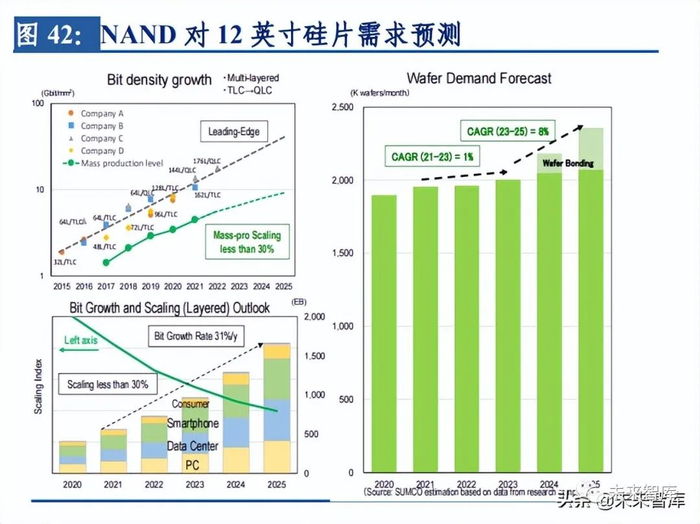 在存储方面,随 5G 时代对信息传输速度以及传输容量的需求提升,DRAM 产品的应用 市场结构将会提升。根据 SUMCO 预测,2021-2025 年 DRAM 位元需求复合增速达 20%, 其中 10%是 DRAM 所需晶圆供给的复合增速,剩下 10%的增速由 DRAM 工艺迭代满足。伴随数据流量的爆发,激发对服务器的需求,服务器需求上升也会激发对 NAND 的需求, 根据 SUMCO 预测,2021-2025 年 NAND 位元需求复合增速达 31%,2023-2025 年所需晶 圆供给 CAGR 为 8%。