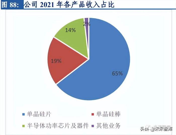光伏+半导体两大主营收入高增长。2021 年全年公司实现营收 411.05 亿元,同比增长 116%。分产品类型来看,光伏硅片、光伏组件、半导体材料、半导体器件、光伏电站发 电收入分别为317.97亿元、61.19亿元、20.34亿元、0.92亿元、5.33亿元,同比增长124.54%、 129.32%、50.61%、-45.21%、0.23%。