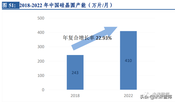 半导体硅片产能持续向中国转移。据 ICInsight 对未来产能扩张预测,2022 年中国大陆晶 圆厂产能预计将达 410 万片/月,占全球产能 17.15%。