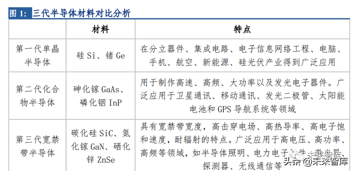 半导体材料是指在常温下导电能力介于绝缘体和导体之间的材料,具有热敏特性、光电 特性、导电特性、掺杂特性、整流特性等优良的物理化学属性。其发展历程可大致分为 三代,第一代半导体材料以硅基、锗基半导体为首,工艺技术成熟,成本稳定,应用广 泛。第二代半导体材料以砷化镓(GaAs)、磷化铟(InP)为代表。第三代半导体材料主 要包括碳化硅(SiC)、氮化镓(GaN)、硒化锌(ZnSe)等,因其禁带宽度较大,又被 称为宽禁带半导体材料。三代半导体材料之间并非替代关系而是在部分运用领域存在相 似特性,在运用领域根据产品具体的特性要求,选择的半导体材料也不尽相同,其综合 性能及性价比各有所长。