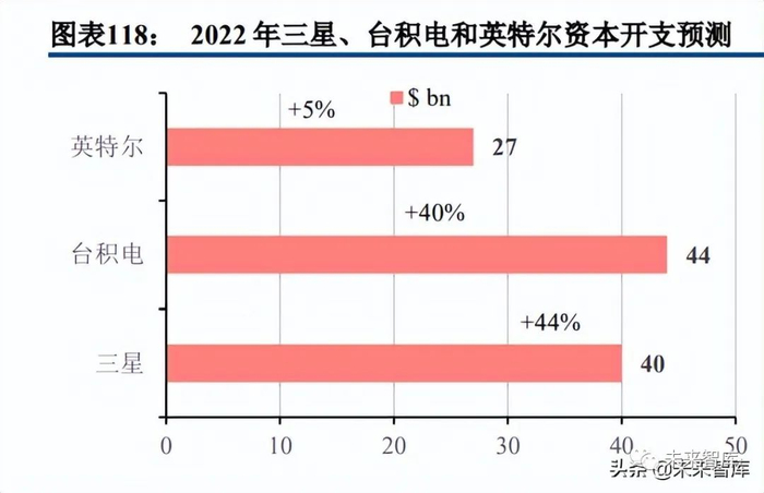先进制程工艺迈入 3nm 时代,台积电资本开支超越三星达到 420 亿美元。随着智能手机的销量放缓进入 平稳增长期,绝大部分晶圆代工厂都停止了 10nm 以下先进制程的产能投入,全球范围内只剩下台积电、三星 和英特尔仍然在进行先进制程的军备竞赛,台积电预计在 2022 年下半年量产 3nm,三星的 3nmEUV 工艺也是 在 2022 年下半年投产,CPU 霸主英特尔的 7nm 工艺预计在 2023 年正式量产。根据全球三大半导体龙头厂商 的资本开支规划,台积电预计在 2022 年的资本支出超过三星达到 420 亿美元,同比增长 40%,三星资本开支 放缓至 5%的年成长率,预计达到 400 亿美元,而英特尔资本开支在 2022 年同比大幅增长 40%达到 270 亿美元 位列行业第三位,三者合计资本开支占全球比例达到 57%。