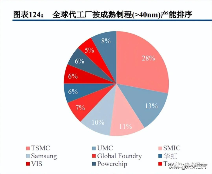 对于外部晶圆厂来讲,40nm-130nm 成熟晶圆代工产能扩产较为缓慢。根据 IC Insights 数据,预计 2022 年 IC 晶圆产能(等效 8 英寸)约为 2.64 亿片,同比增长 10.87%,其中成熟制程(28nm 以上)产能 1.15 亿片, 同比增长 7.97%,扩产速度较为缓慢。(报告来源:未来智库)