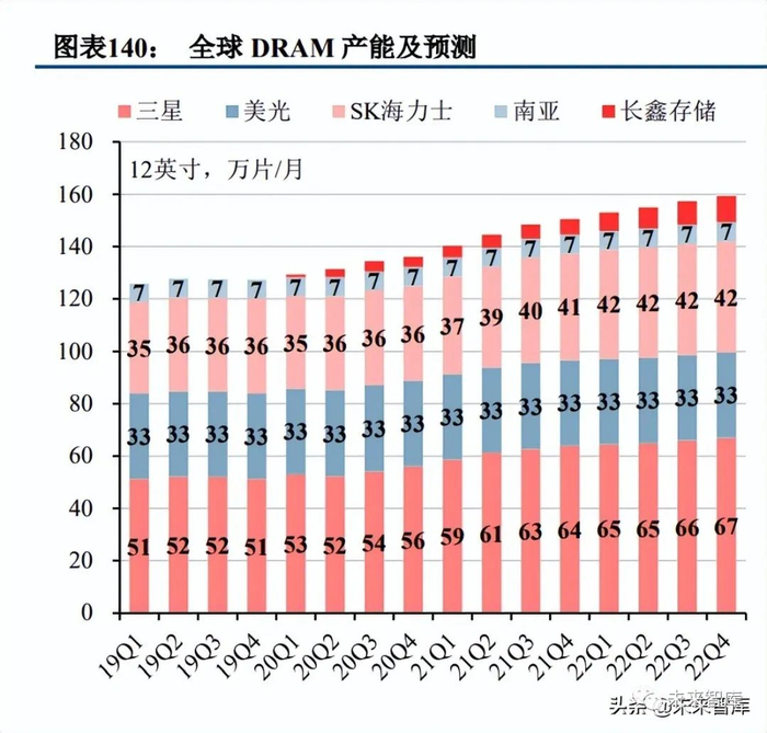 (2)产能扩张:2021-2022 年 DRAM 和 NAND Flash 产能稳定增长。我们统计了 DRAM 和 NAND Flash 主要厂商的产能及预测,DRAM 厂商选取三星电子、美光、SK 海力士、南亚科技、长鑫存储等 5 家,NAND Flash 厂商选取三星电子、美光、SK 海力士、Flash Alliance(东芝+西部数据)、英特尔、旺宏、 长江存储等 7 家。整体来看,2020 年、2021 年、2022 年 DRAM 产能分别同比增长 4.5%、9.9%、7.0%至 531、584、625 万片/年,NAND Flash 产能分别同比增长 1.7%、6.7%、5.9%至 688、734、777 万片/年, 加上部分无法归属于 DRAM 或 NAND Flash 以及 NOR Flash、SRAM 等小类存储的产能,2020 年、2021 年、2022 年存储芯片整体产能分别同比增长 0.0%、7.6%、5.6%至 1258、1354、1429 万片/年,产能稳定 增长。