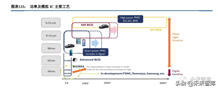 经过 35 年的发展,意法半导体开发了一系列对全球功率 IC 影响深远的 BCD 工艺,如 BCD3(1.2 微米)、 BCD4(0.8 微米)、BCD5(0.6 微米)。目前主要的 BCD 技术包括 BCD6(0.35 微米)/BCD6s(0.32 微米)、 BCD8(0.18 微米)/BCD8s(0.16 微米和 BCD9(0.13 微米)/BCD9s(0.11 微米),其第十代 BCD 工艺采用 90 纳米。BCD6 和 BCD8 还提供 SOI 工艺选项。从应用特点可以分为高压 BCD 和高密度 BCD 两种类型。高压 BCD 技术能让低压控制电路和输出电压高 达 800V 的高电压 DMOS 级安全地共同存于同一颗芯片上。在 SOI(绝缘体上硅)衬底上集成 BCD 的解决方 案适合与电子医疗、汽车安全、音频相关的特定的高价值应用,制程在 0.16 微米及以上。高密度 BCD 能满足 在同一芯片上集成越来越复杂的多样化功能的需求,并在各种应用环境中保证高质量和可靠性,未来将推出基 于 40 纳米的 BCD40 工艺。