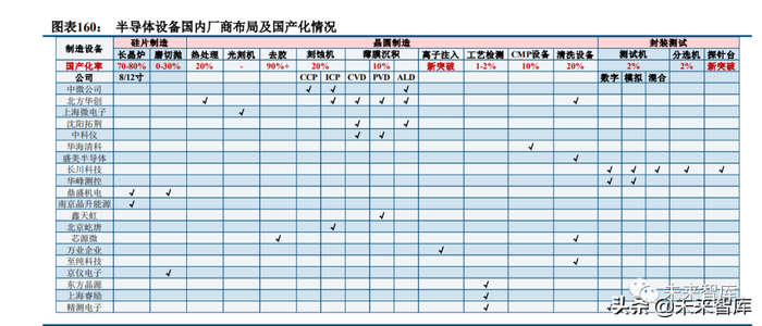 国产设备厂商产品线逐步完善,在各自优势环节逐渐突破。根据本土主要晶圆厂设备采购情况的统计数据, 目前去胶设备国产化率达到 90%以上,主要代表厂家为屹唐半导体;清洗设备国产化率约 20%,主要代表厂家 为盛美上海、北方华创、至纯科技,刻蚀设备国产化率约 20%,主要代表厂家为中微公司、北方华创、屹唐股 份;热处理设备国产化率约 20%,主要代表厂家为北方华创、屹唐股份;PVD 设备国产化率为 10%,主要代 表厂家为北方华创;CMP 设备国产化率为 10%,主要代表厂家为华海清科;涂胶显影设备实现零的突破,主 要代表厂家为芯源微;光刻设备预计实现零的突破,主要代表厂家为上海微;离子注入机实现零突破,代表厂 家为万业企业(凯世通);量测设备实现零的突破,代表厂家为精测电子;此外,华峰测控与长川科技实现了 测试设备比较大的突破。