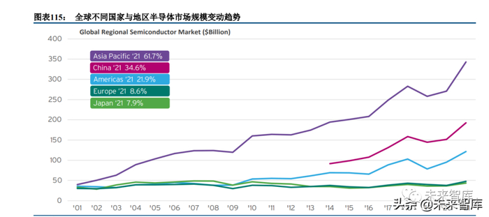 2005 年以后国内 IC 市场已经成为全球最大的半导体市场,2021 年占全球市场份额达到 34.6%。未来国内 本土企业市场空间仍然有较大的空间。根据 IC Insights 统计,中国大陆消耗的集成电路市场规模达到 1865 亿 美元,其中由中国大陆供应的芯片产值仅能够满足其中 16.7%的份额,对应的市场规模为 312 亿美元。国内本 土芯片厂商 2021 年集成电路销售规模为 123 亿美元,可见国内集成电路市场的国产化率仅为 7%,与国内市场 占全球 34.6%的市场占比相比成长空间较大。