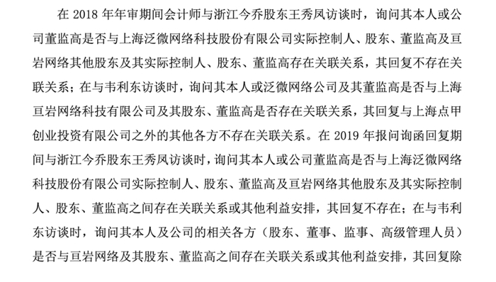 在2018年年审期间和2019年报问询函回复期间,审计人员又专门询问王秀凤是否与泛微实控人、股东、董监高存在关联关系,这位倔强的女人均坚称不存在关联关系,韦利东也一样,在被问及本人或泛微及其董监高是否与亘岩网络及其股东、董监高是否存在关联关系时,同样否定与点甲创投之外的其他各方存在关联关系或其他利益安排。是不是离谱他爹给离谱开门,离谱到家了?