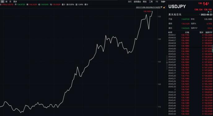 6月21日,日元对美元汇率一度跌破136,创下1998年10月以来的新低。截至北京时间晚上21:15分,美元对日元汇率报136.14,上涨0.76%。数据显示,自今年3月份以来,日元对美元累计贬值18%。