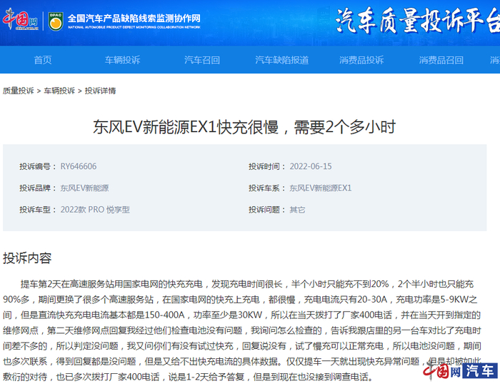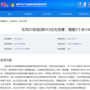 近日,中国网汽车质量投诉平台就接到一位东风EV新能源EX1车主有关车辆快充过慢的投诉。她向记者介绍,自己的车(2022款 PRO 悦享型)刚刚提车第二天,在高速服务站用国家电网的快充充电,发现其存在充电时间过长的问题:“半个小时只能充不到20%,2个半小时也只能充90%多!”