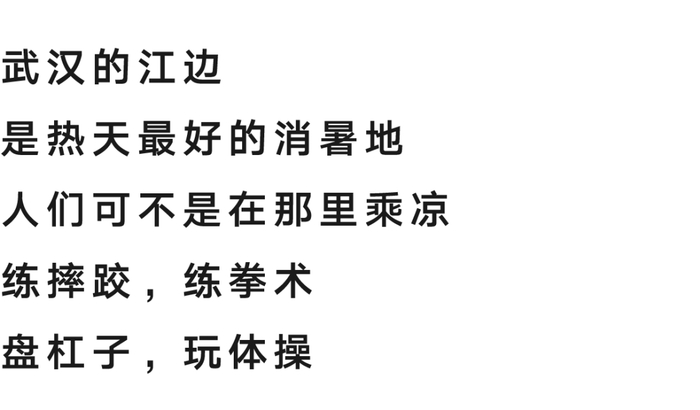 武汉的江边是热天最好的消暑地,人们可不是在那里乘凉,扇子干脆不扇了,小伢在那里练摔跤,练拳术,盘杠子,玩体操。