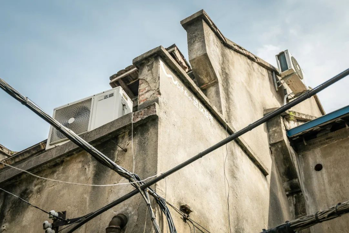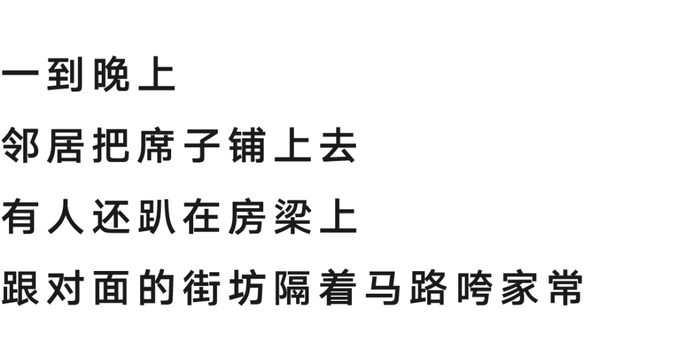 一到晚上,居民们把席子铺上去,一个个晒台上三四家人,街坊隔着马路在半天云里咵天。