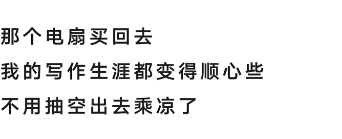 那是一台立式电扇,非常重,底盘是铸铁的,吹风不两边摇晃,那个电扇买回去,我的写作生涯都变得顺心些,不用抽空出去乘凉了。