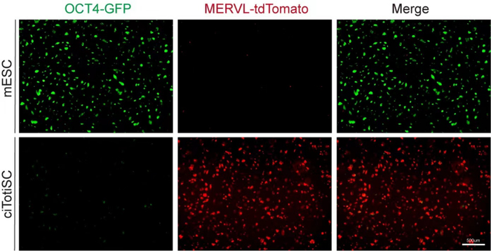 从mESC 到 ciTotiSC 的化学定向诱导(OCT4l绿色荧光标记的是多能干细胞,MERVL红色荧光标记的是全能干细胞)