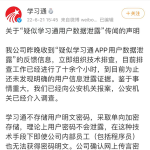 针对此事,学习通当天回应称,其不存储用户明文密码,采取单向加密存储,理论上用户密码不会泄露,“公司确认网上传言密码泄露是不实的”。学习通表示,收到用户数据疑似泄露的消息后已连续技术排查十余小时,暂未发现明确的用户信息泄露证据,公安机关已经介入调查。