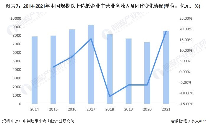 2014-2021年,我国规模以上造纸企业主营业务收入呈波动递增趋势,2018年以来,随着我国造纸行业落后产能淘汰工作的持续深入以及原材料价格波动影响,我国规模以上造纸企业主营业务收入有所下滑;2021年,我国2426家造纸行业整体营收为8551元,同比增长19.00%;亏损企业有452家,占比18.63%。
