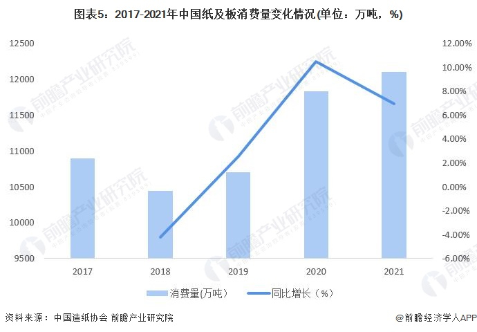 纸及纸板消费方面,中国造纸协会统计数据显示,2018年以来,我国纸及纸板消费量及增速均呈逐年递增趋势。2021年我国纸及纸板消费再创新高,全年消费12648万吨,达到历史峰值,同比增长6.94%。