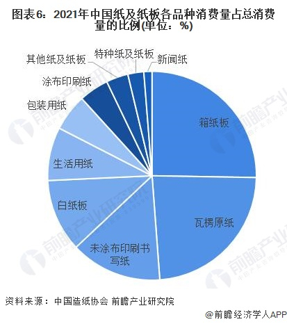分产品来看,2021年箱纸板消费量达3196万吨,同比增长12.65%,占比25.27%;瓦楞原纸消费量达2977万吨,同比增长7.24%,占比23.54%;未涂布印刷书写纸消费量达1793万吨,同比增长0.56%,占比14.18%。