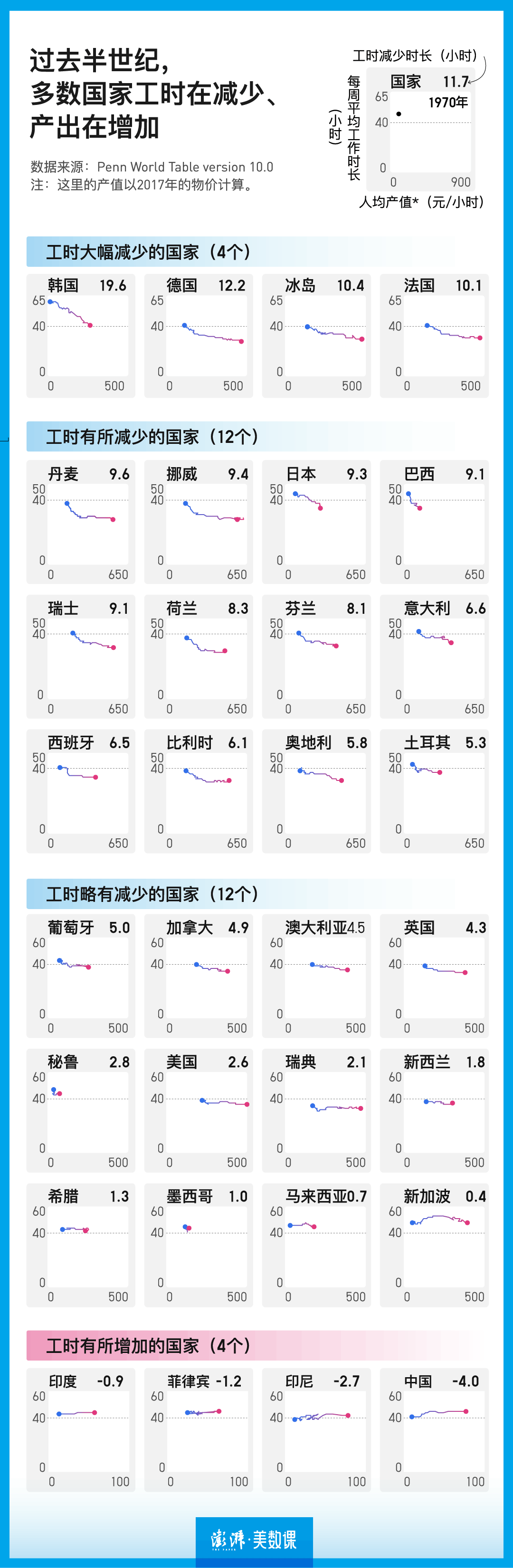 近50年的数据也向我们展示了相似的情况:随着生产力的提升,人均产值越来越高,劳动者需要工作的时间也越来越短。