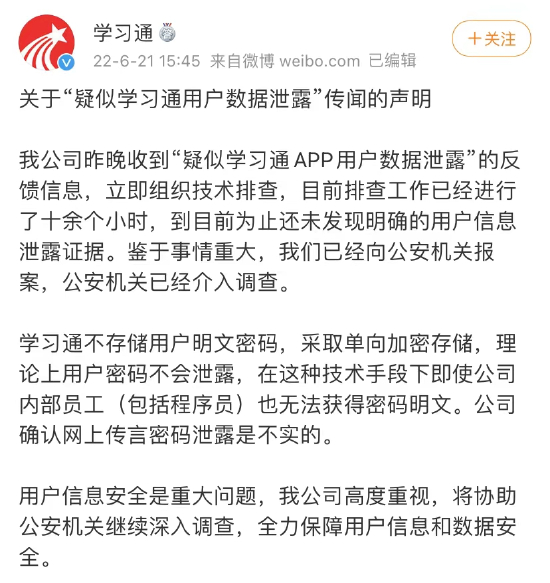 昨日下午,学习通官方微博回应称,公司已组织技术排查,到目前为止还未发现明确的用户信息泄露证据。鉴于事情重大,我们已经向公安机关报案,公安机关已经介入调查。