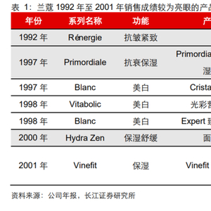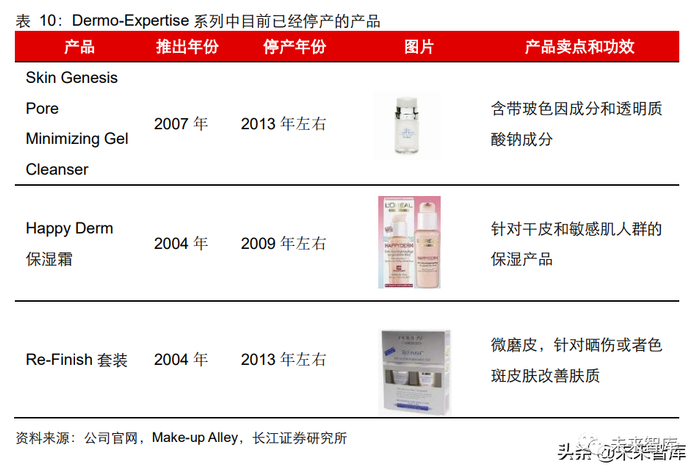 高速的品类扩张阶段中也存在结果不尽意如意的产品系列,例如巴黎欧莱雅曾进军皮肤 学级护肤领域,但该系列目前有部分产品已经停产。巴黎巴黎欧莱雅于本世纪初推出的 功效护肤系列 Dermo-Expertise,虽在早期获取了较好的销售成绩但该系列较多产品后 续停产,我们预计主因:该系列在后期的产品推新,与早期的皮肤学级护肤品定位不相 符合:早期 Dermo-Expertise 以皮肤学级抗衰为主,2004 年推出的 Re-finish 套装功效 明确,主打针对晒伤或色斑皮肤人群改善护肤,产品推出后得到较好反响,而在此之后 的新品与功效护肤定位逐渐背离,例如 2007 年推出 Skin Genesis 眼霜主打抗衰和保湿 功效,核心成分为玻色因(抗衰)、透明质酸(保湿)成分,或是 2008 年推出的 Derma Genesis 精华,功效主打细小毛孔和嫩肤,核心成分为玻色因。(报告来源:未来智库)