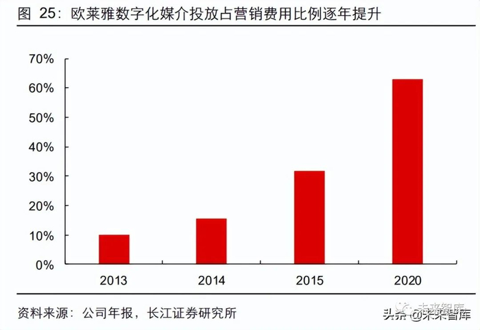 同时,欧莱雅集团将营销资源全面向线上倾斜,搭建了数字化营销的完整链路。从 2014 年开始,欧莱雅数字化媒介投放占营销费用的比例开始加速提升,在集团层面的营销资 源倾斜下,欧莱雅搭建了一条从社交媒体的种草曝光,到电商站内的引流投放,到私域 流量运营的数字化营销链路,目前欧莱雅在中国的营销费用中约有 80%为线上营销投 入,其中站内、站外投放各占一半。