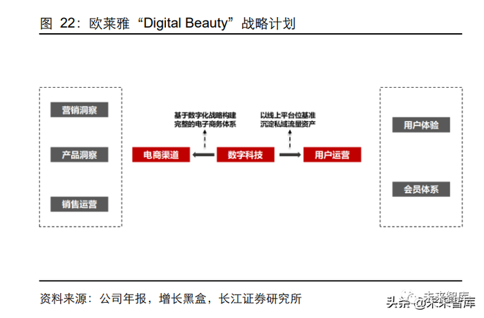 此外,对终端消费趋势的把控来源于公司持续深化的消费者洞察能力。2010 年之后美 妆妆品零售的人货场经历了快速的变化,其一是数字化的到来使得营销和销售渠道逐步 从线下向线上进行转移,其二消费者结构向新世代迁移,且消费喜好更为细分,场景更 为个性化。然而彼时欧莱雅以线下零售渠道为主,营销以电视、杂志等媒介,传统的市 场策略无法满足“人”、“场”的快速更迭。