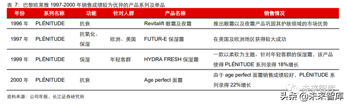 早期 PLÉNITUDE 产品系列以保湿和洁面为主,在上世纪末向抗衰领域进军。巴黎欧莱 雅的护肤产品统一归类于 PLÉNITUDE 系列,早期产品以保湿和洁面为主,1997 年巴 黎欧莱雅进军抗衰护肤领域推出了 Revitalift 眼霜及夜霜,2000 年推出 Age perfect 面 霜,该年 PLÉNITUDE 系列录得 22%增长。