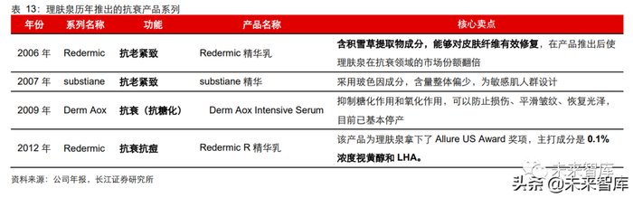 在深耕了多年的敏感肌人群市场后,2006 年开始理肤泉针对其核心用户群体推出相应 的抗衰产品,挖掘用户的增量消费场景。2006 年理肤泉推出 Redermic 系列,含积雪草 提取物成分,能够对皮肤纤维有效修复,2007 年推出 substiane 系列含带 3%玻色因成 分。理肤泉抗衰类产品普遍具有“温和”+“抗衰”兼具的效果,紧紧围绕原始客群需 求,对敏感肌人群较为友好。理肤泉所推出的抗衰系列人群定位敏感肌人群,效果相对 温和,例如 2006 年推出的 Redermic 含有的积雪草成分在不含刺激性效果的前提下促 进皮肤胶原蛋白生成改善皮肤弹性,2007 年推出的,substiane 精华液仅含有 3%的玻 色因成分,使用效果比较温和。例如 2009 年推出的 Derm Aox 系列目前已停产,Derm Aox 含有抗糖化成分肌肽和基于碧萝芷的抗氧化复合物,能抑制真皮层内的糖化反映, 从而抑制老化的过程,Derm Aox 后因销售成绩欠佳缘故于 2015 年左右的时间停产。