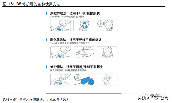在这一阶段理肤泉推出的产品中,较为突出的是被誉为“万能修护霜”的 CICAPLAST B5 修护霜,其畅销的原因在于通过简单的配方满足消费者的日常修护需求。自 2010 年 后理肤泉进军皮肤修护赛道,其中于 2011 年推出的 CICAPLAST BAUME B5 修护霜是 目前其天猫旗舰店畅销单品之一,B5 修护霜的主要配方为积雪草苷和铜,锌,锰微量 元素修护组合,成分配比简单,但该产品能够通过不同涂抹方法来达到印痕受损、泛红、 干裂等修复效果,有效针对敏感肌肤人群的日常皮肤修护,这也使得 B5 修护霜具有较 高的复购率,截止于 2022 年 5 月 27 日,理肤泉 B5 修护霜位居天猫回购榜单第一。