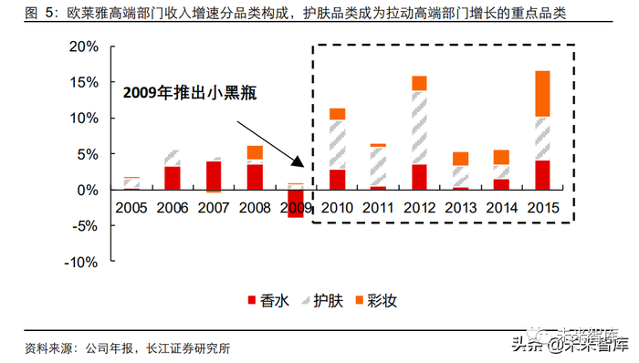 2009 年兰蔻凭借超级大单品小黑瓶肌底液,实现了品牌销售规模跃升。2009 年,历时 14 年研发的 Génifique Youth Activator(兰蔻小黑瓶)肌底液上市,2009、2010 年兰 蔻全球共销售小黑瓶肌底液超 200、300 万瓶,时至今日小黑瓶仍是兰蔻产品中最为畅 销的产品系列,推动 2010 年兰蔻品牌重归双位数的收入增长,且从 2011 年开始,以 兰蔻为主力品牌的欧莱雅集团高端化妆品部门的增速开始显著领跑大众化妆品部门,正 式成为推动欧莱雅集团增长的新引擎。